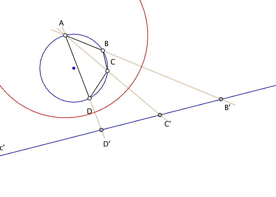 Como os pontos $A, B, C$ são colineares (sobre uma reta $a$). os seus inversos $A', B', C'$ ou são colineares ou são concíclicos.